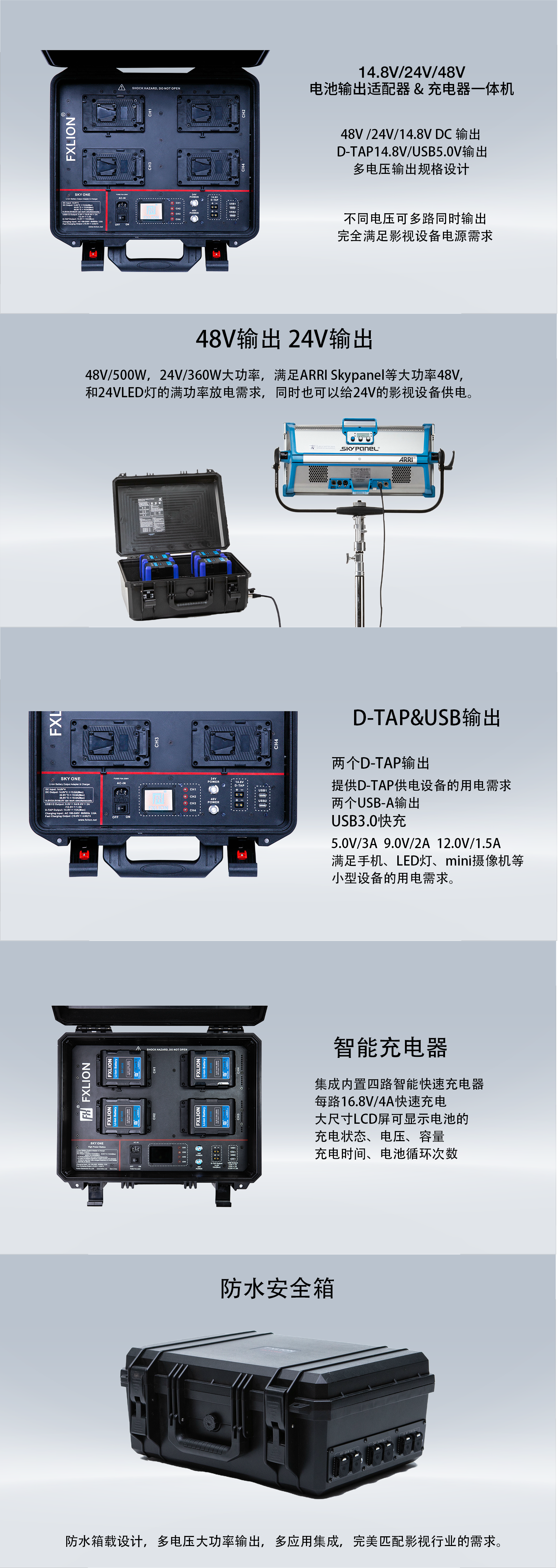 - 48V/500W大功率,滿足ARRI Skypanel等大功率48V LED燈的滿功率放電需求