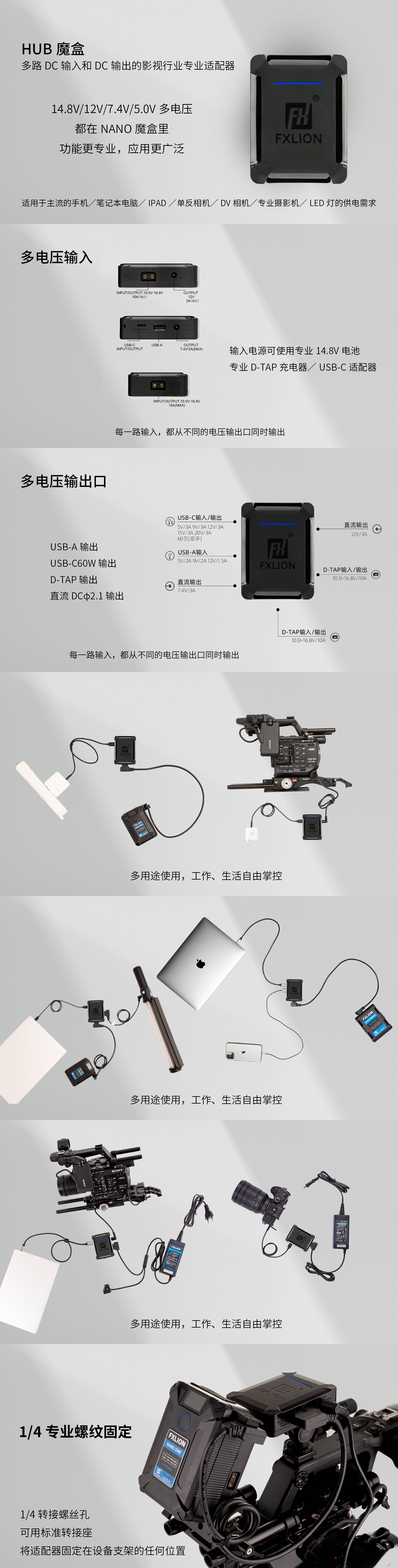 14.8V電池輸入或者D-TAP充電器輸入,可同時輸出14.8V/12V/7.4V/USB-A/USB-C